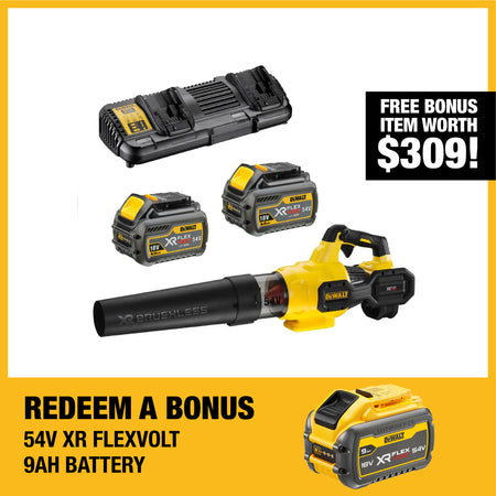 Tackle your toughest outdoor cleaning tasks with the DEWALT DCMBA572N-MM2 54V 12Ah XR Axial Blower Kit. This powerful kit includes the DCMBA572N-XE Blower and the XR FLEXVOLT 6Ah Starter Kit (DCB132T2-XE) featuring 2x 18V 6Ah Batteries and a Dual Port Multi Voltage Charger.