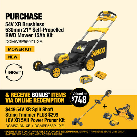DeWALT 54V XR Brushless 530mm 21" Self-Propelled RWD Mower 15Ah Kit - Ideal for heavy users who are looking for a quiet but powerful mower