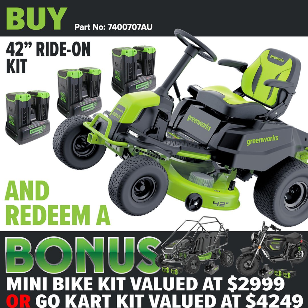 - 1x 60V Pro 42” Ride-On Lawnmower