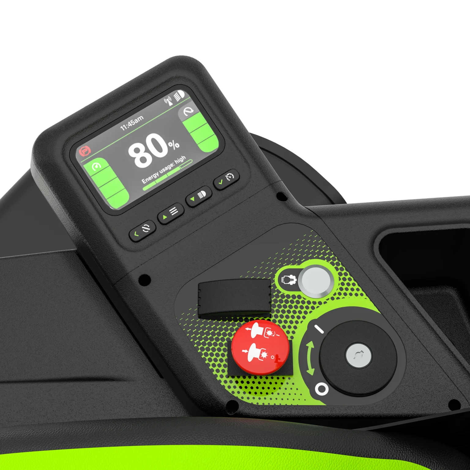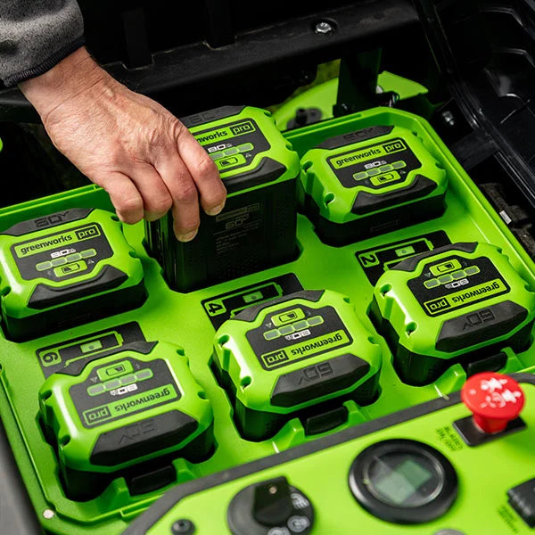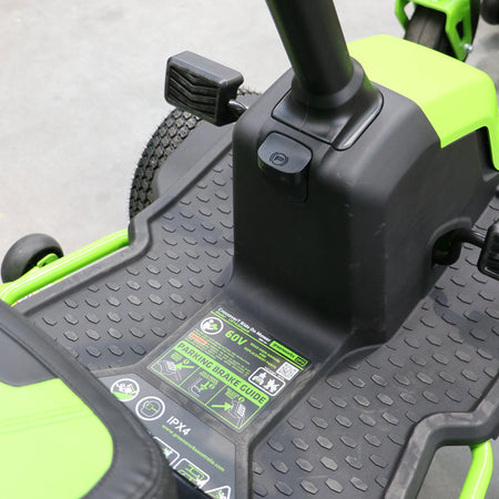 This unit is powered by six (6) state-of-the-art, removable 60V 8.0Ah lithium-ion batteries, giving you the ability to mow up to 2 acres and charges in 60 minutes with the on board charging system – powered by a 1.5kW wall mount charger.