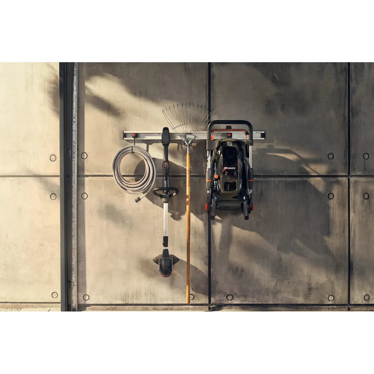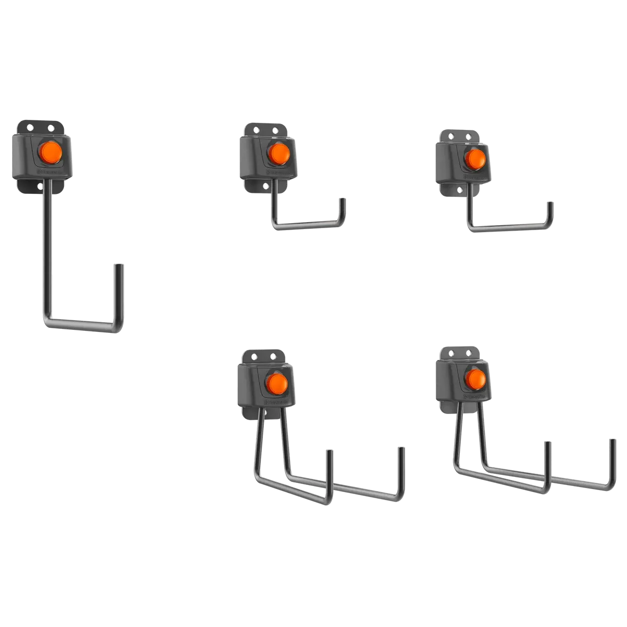 An accessory in the Aspire storage system, this 5-hook kit is optimised to fit the full Husqvarna Aspire range as well as the most common garden tools in your shed, such as hand tools, water hoses or brooms. Each hook can be attached to the wall-mounted Aspire storage rail or installed directly onto the wall – enabling smart, effective storage. Coming in varying sizes, these single and double hooks of premium material conveniently and neatly organise all your garden tools with limited space.