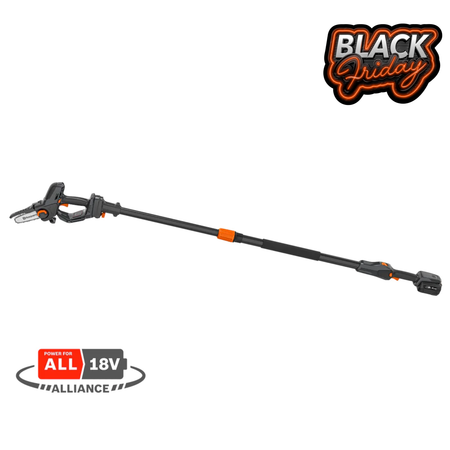 A battery pruning saw to be used with or without extension pole. Easily attach and adjust the pole up to 1,7m, making it easier to reach higher branches. Built on our proven chainsaw expertise, it’s robust enough to easily cut branches 75mm wide. Equipped with a soft grip handle with an easy and tool free replacement of chain and bar and improved safety with the automatic shutdown when left unattended. Storage is made easy with the included hook and part of the 18V POWER FOR ALL battery system.