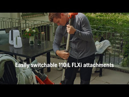 DH110 FLXi hedge trimmer attachment with adjustable trimming angle and dual action blades. The adjustable cutting position makes it easier to trim in hard-to-reach areas. Easy storage with included hook.