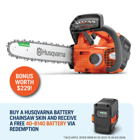 Purchase this eligible Husqvarna product during the promotional period and redeem a free 40-B140 battery via Husqvarna’s online redemption portal. Simply keep your tax invoice and scan the QR code provided to submit your claim. Offer valid for purchases made between 01.12.25 and 28.02.26, while stocks last. Terms and conditions apply.